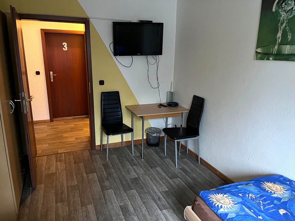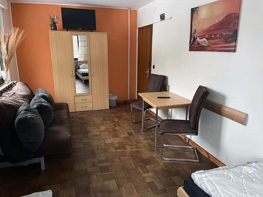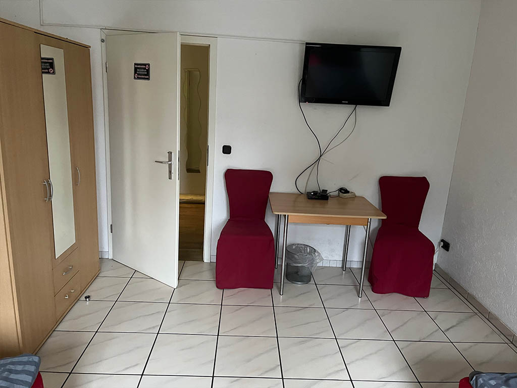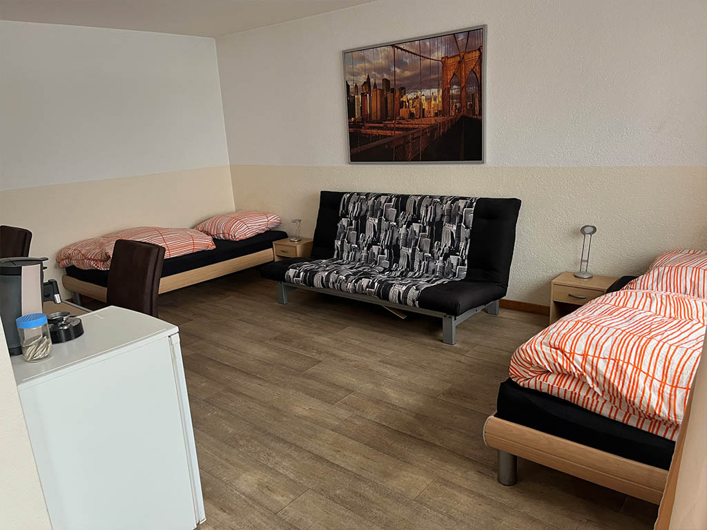 Zimmer 2 ist für bis zu 3 Personen geeignet. Bad und Küche werden gemeinsam genutzt. Ideal, wenn man mit Kollegen oder als kleines Team unterwegs ist.