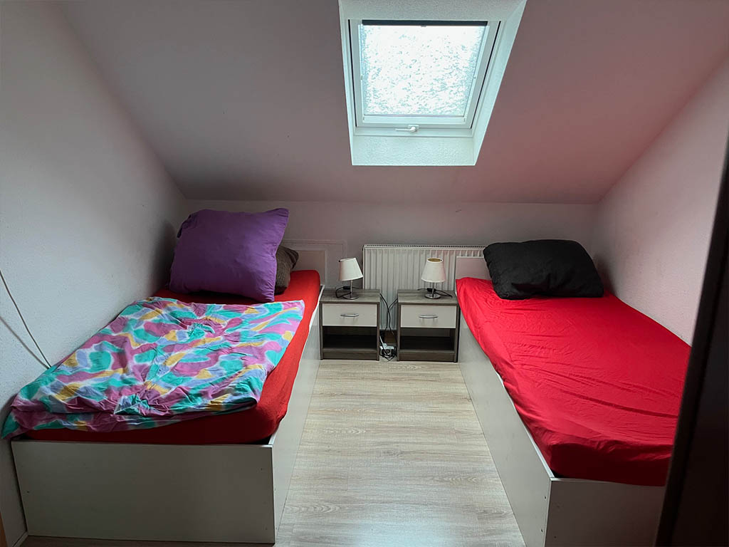 Zimmer 2 kann bis zu 3 Personen aufnehmen. Bad und Küche werden gemeinsam genutzt.