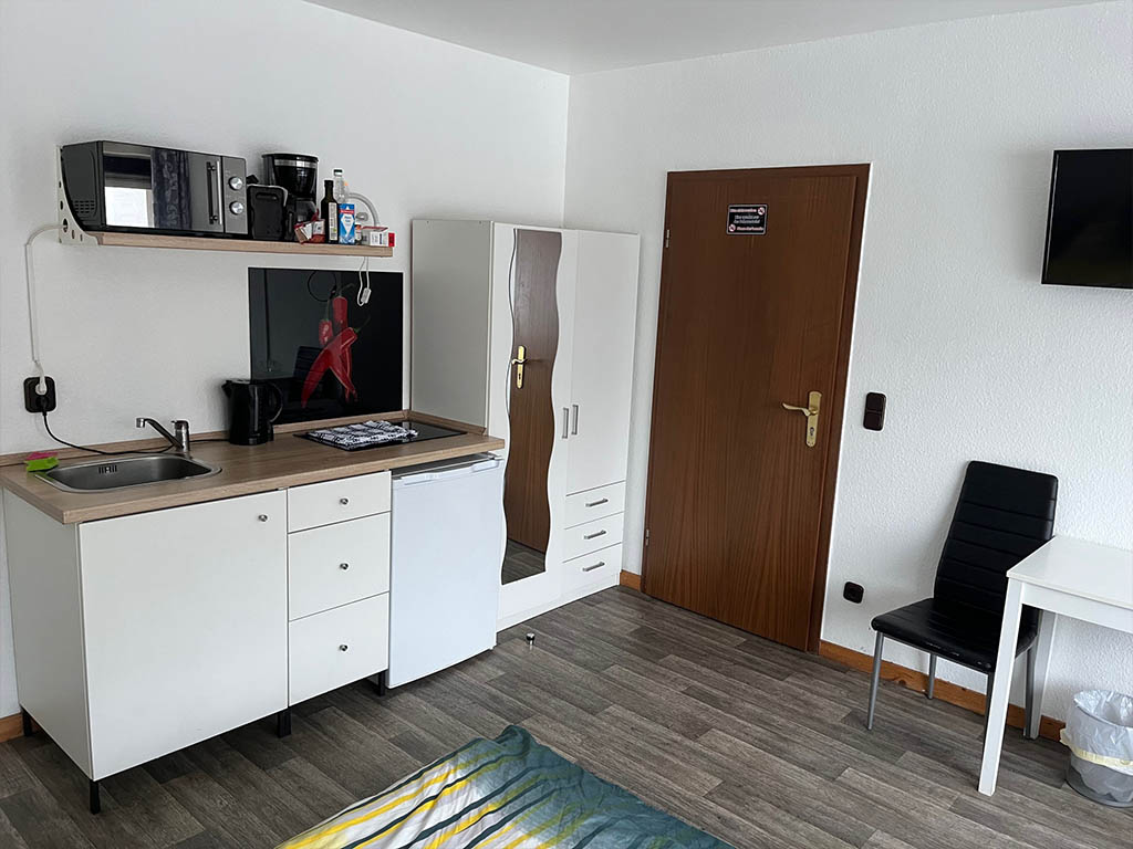 Zimmer 3 ist ein Apartment für 2 Personen mit eigenem Bad, eigener Küche und Balkon.